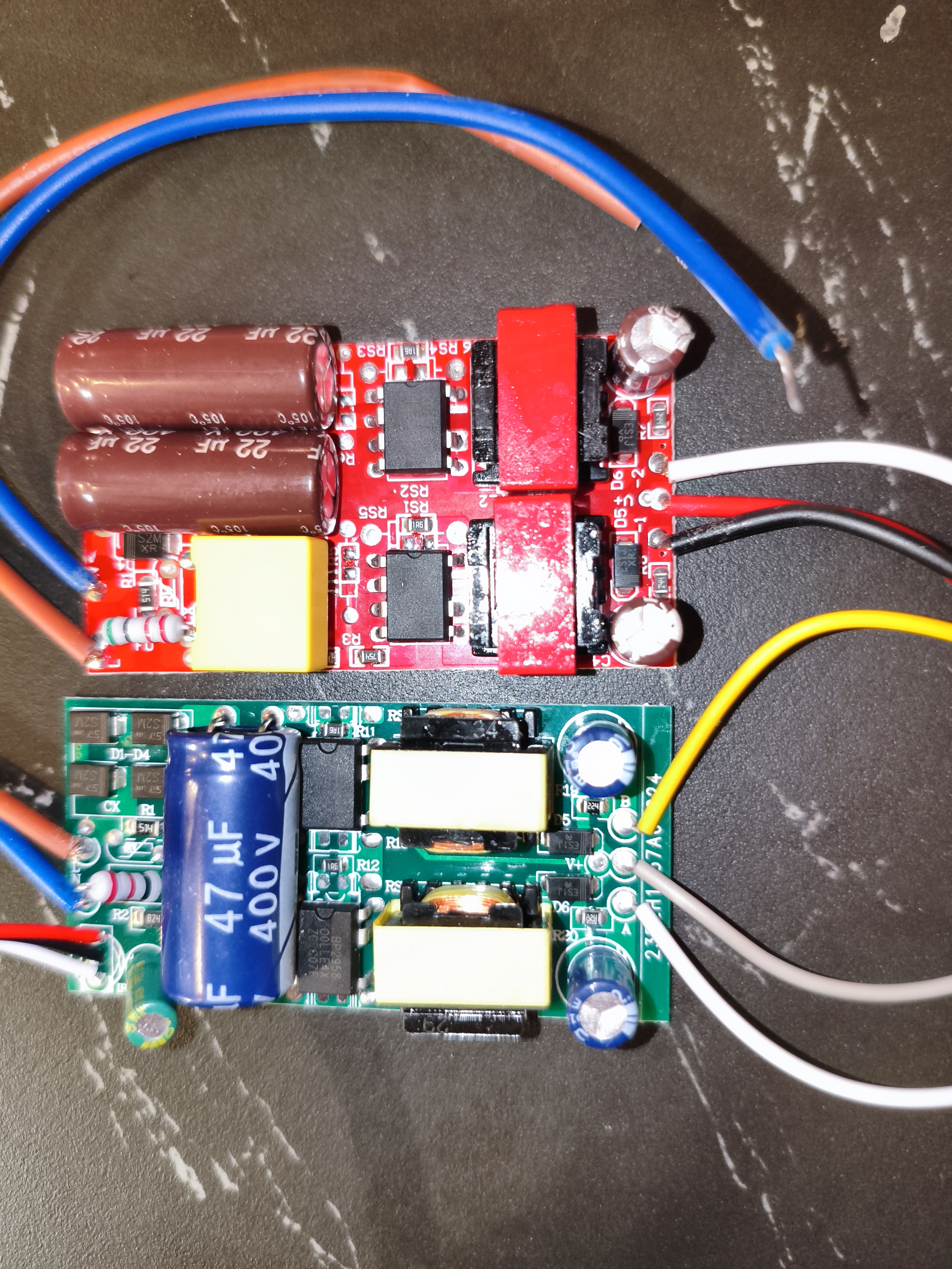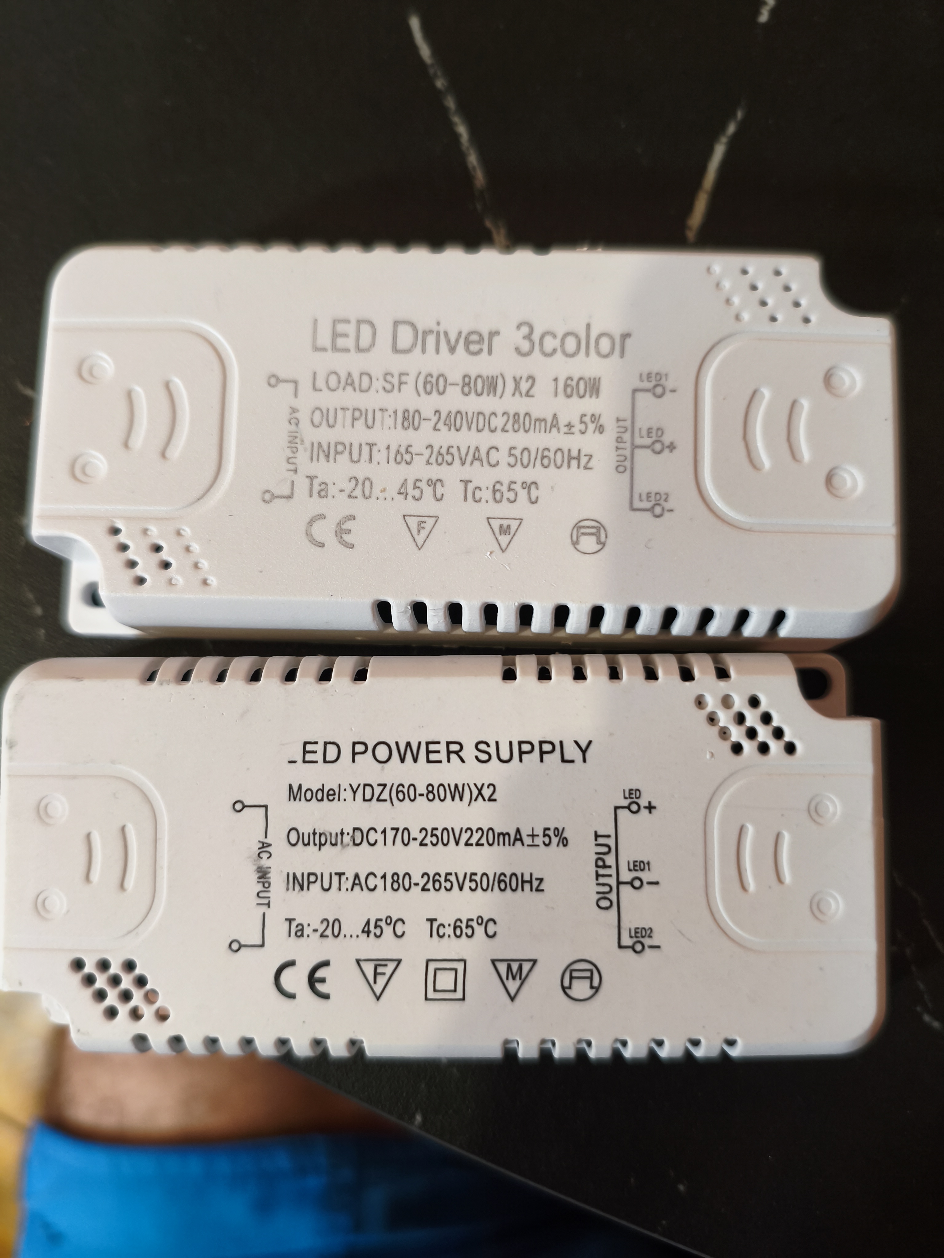 Здравствуйте! Эксперты, пожалуйста, помогите, дайте совет. Купил диодный светильник. С холодным и теплым светом. Смена режима происходит через вкл/выкл выключателя. Но одна проблема — очень яркий. Нужно его «приглушить» по яркости. Нашел новый драйвер с возможностью регулирования яркости посредством пульта. Вроде подобрал по параметрам очень похожий. Но светильник с ним вообще не запустился. Путем перебора подключения контактов добился только слабого мерцания. Но при правильном подключении (плюс центральный провод, минус крайние провода) ничего не работает. Подскажите, пожалуйста, подходит ли новый драйвер? Что не так мог сделать при подключении? Фото стокового и нового прикладываю (сверху на фото стоковы, снизу новый драйвер). Спасибо!