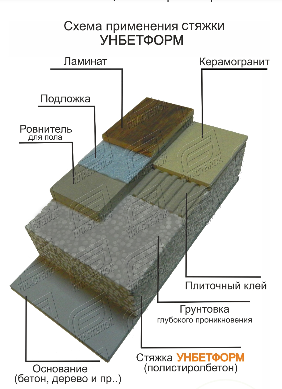 Данный вид смеси, не предназначен для *железнения* керамзитного основания, равно как и связующего. Для этих целей используют пескобетон марки М300 или же другие смеси предназначенные для устройства стяжек. Унбетформ, используется для устройства облегченной базовой стяжки пола, по грунту, бетонным и деревянным основаниям, заливки между деревянными лагами в перекрытиях, чердаков и крышах мансардных этажей.