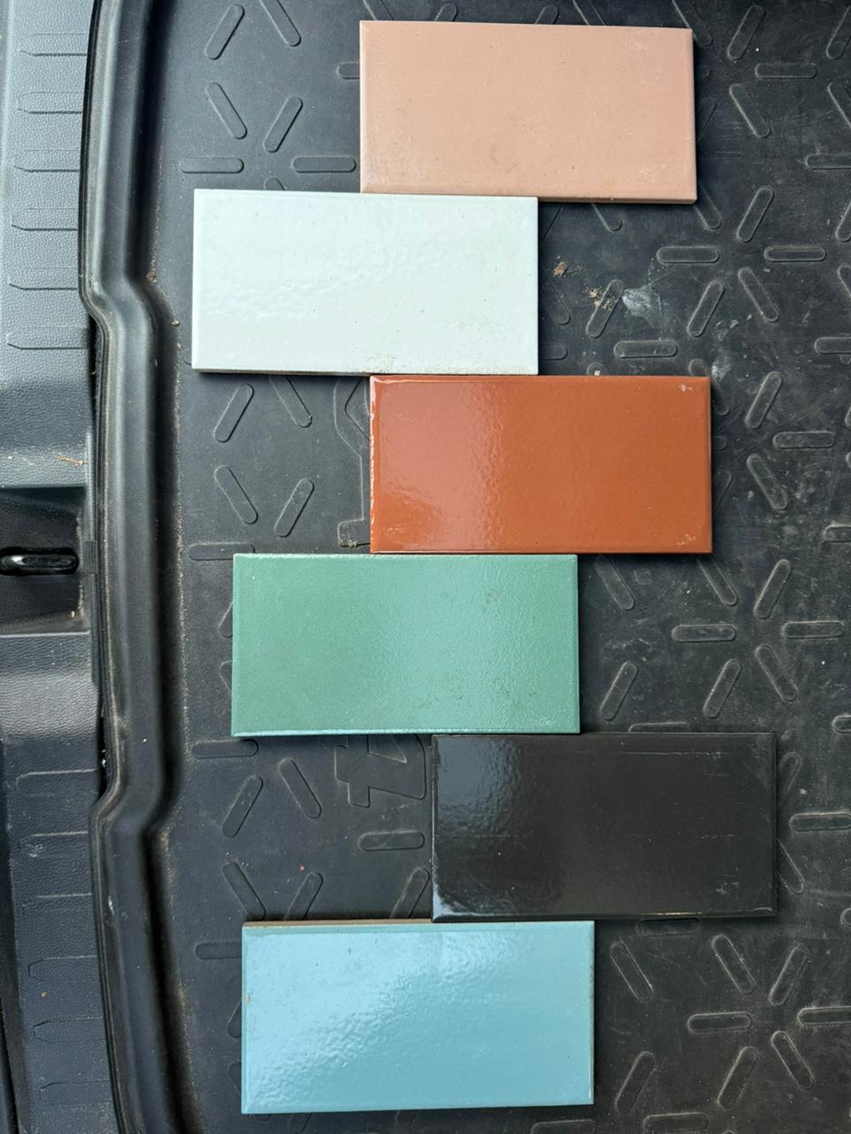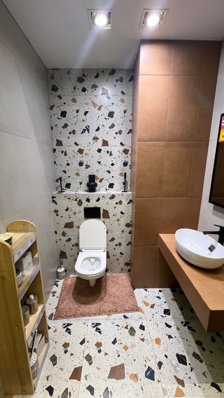 Стены санузла выкладываются двумя видами плитки (широкоформатная плитка 20 на 30 см. и мелкая 11 на 21см.) Полы санузла выкладываются широкоформатной плиткой. Смотрите на картинке.