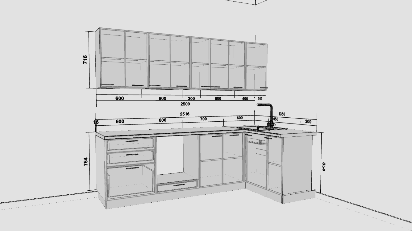 Верхние шкафы только по стороне 250 см. Необходимо будет сделать вырезы под мойку, варочную поверхность, врезную вытяжку. Установить перечисленную технику, смеситель и духовой шкаф. Угол у столешницы соединяется через профиль. У кухни есть фартук из МДФ, необходимо будет сделать вырезы под розетку и установить фартук. Также установить цоколь ПВХ.
