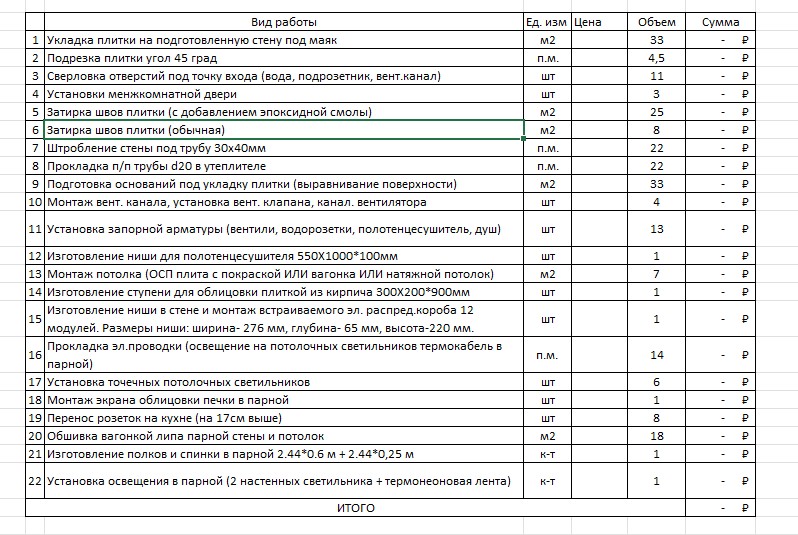 Подробное ТЗ (с фото объекта), перечнем и объемами работ можно найти в этой табличке: