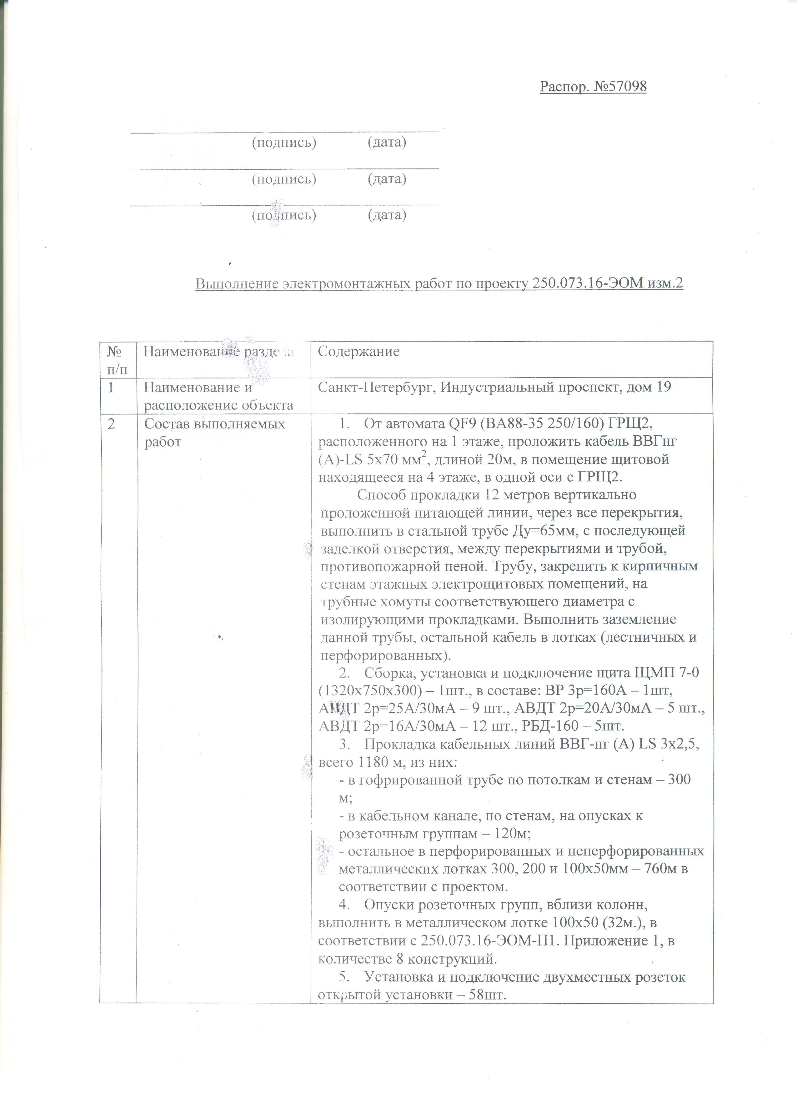 1. Выполнить электромонтажные работы по проекту. От автомата на 1 этаже проложить кабель ВВГнг (А)-LS 5х70 мм2, длиной 20м, до автомата на 4 этаже.